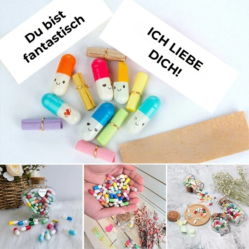 Süßes Kapsel-Design: Jede Kapsel enthält Zettel mit einem süßen Smiley. In jeder Kapsel befindet sich blankes, farbiges Papier, auf das Sie schreiben können, was Sie sagen möchten. Sie sind praktisch in der Anwendung 🤗.